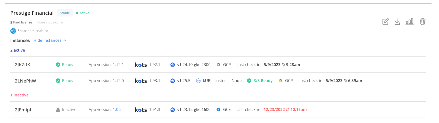 • View instance details for each customer, including the version of the application that this instance is running, the Kubernetes distribution of the cluster, the last check-in time, and more: