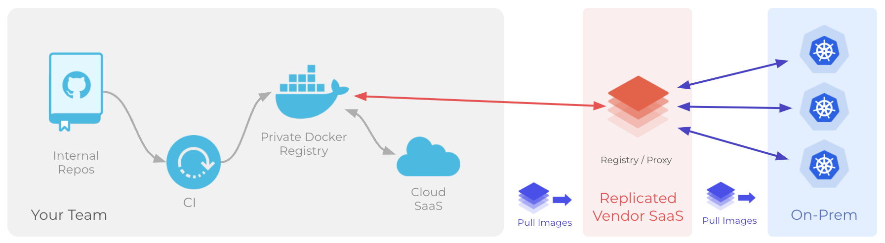If your application images are available in a private image registry exposed to the internet such as Docker Hub or Amazon Elastic Container Registry (ECR), then the Replicated proxy registry can grant proxy, or pull-through, access to the images without exposing registry credentials to your customers. When you use the proxy registry, you do not have to modify the process that you already use to build and push images to deploy your application.
